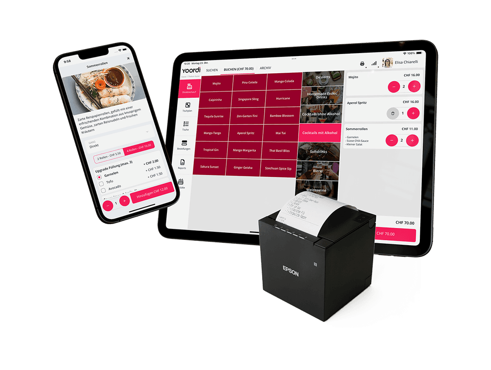 Whether it's a smartphone, tablet, or terminal - Yoordi POS runs on all your devices as an app or in the browser. Simply choose the required modules per device, such as table plan, inventory, or direct sales.
